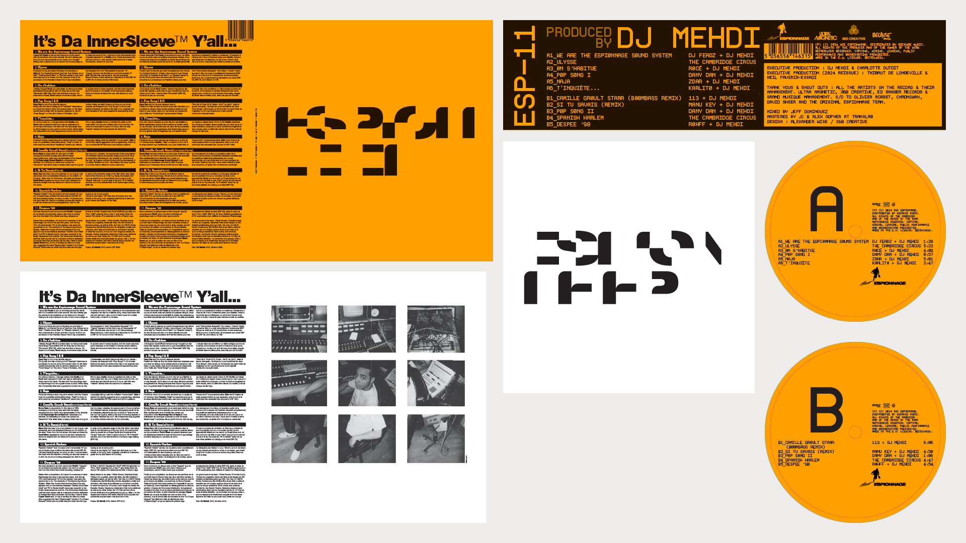 This vinyl reissue builds on the original layering principle I developed for the 2000 CD release. By fragmenting the custom Espion wordmark across two layers of tracing paper, the project name remains encrypted in its disassembled state. The full title is only legible through the superimposition of the translucent substrates.
