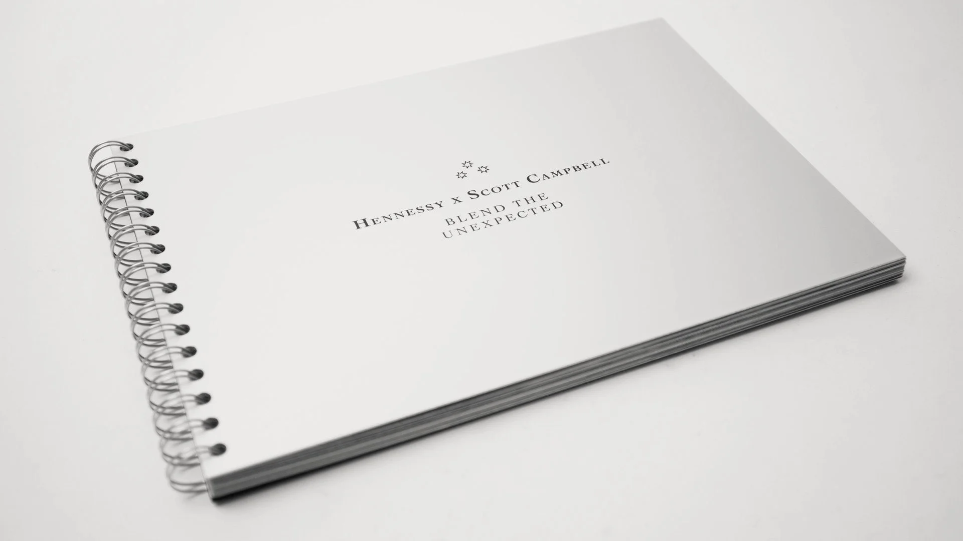 The Hennessy x Scott Campbell lockup was applied via silver hot foil debossing on a heavy-weight black card back cover, anchoring the project in LVMH’s high-luxury production standards.